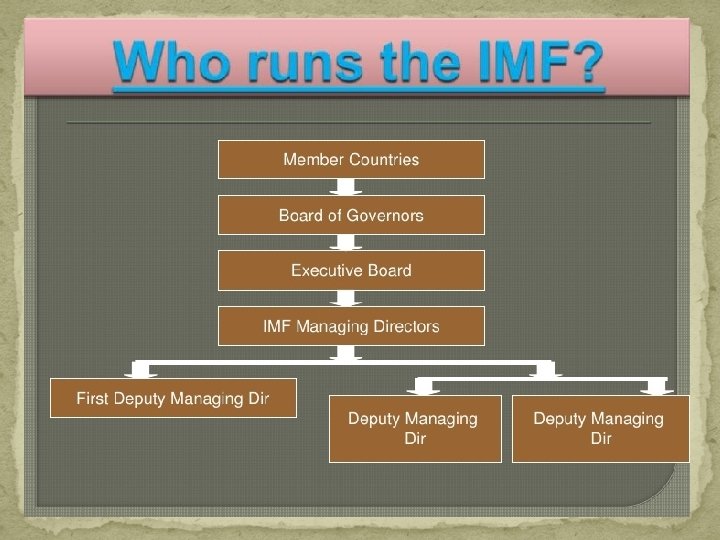 MEMBERSHIP AND GOVERNANCE Ø 186 Member States ØBoard of Governors (1 from Each State) ØManaging Director ØExecutive Board (24 Members) ØWeighted Voting System: o. US Representative holds 17% of total Voting Power o 27 Countries together hold 1. 4% of total Voting Power o. Decisions are most often made by consensus, rather than fractious parliamentary fights. ØBoard of Governors: one governor from each member country. Meets once a year. ØDay to day affairs are guided by the Executive Board & 24 Executive Directors. Managing Director of IMF is Chairman of Executive Board.