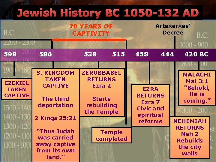 Jewish History BC 1050 -132 AD 70 YEARS OF CAPTIVITY 598 EZEKIEL TAKEN CAPTIVE 586 538 515 S. KINGDOM TAKEN CAPTIVE ZERUBBABEL RETURNS Ezra 2 The third deportation Starts rebuilding the Temple 2 Kings 25: 21 “Thus Judah was carried away captive from its own land. ” Temple completed Artaxerxes’ Decree 458 444 EZRA RETURNS Ezra 7 Civic and spiritual reforms 420 BC MALACHI Mal 3: 1 “Behold, He is coming. ” NEHEMIAH RETURNS Neh 2 Rebuilds the city walls