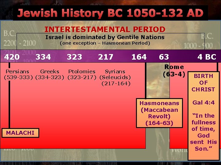 Jewish History BC 1050 -132 AD INTERTESTAMENTAL PERIOD Israel is dominated by Gentile Nations (one exception – Hasmonean Period) 420 334 323 217 Persians Greeks Ptolomies Syrians (539 -333) (334 -323) (323 -217) (Seleucids) (217 -164) 164 63 Rome (63 -4) Hasmoneans (Maccabean Revolt) (164 -63) MALACHI 4 BC BIRTH OF CHRIST Gal 4: 4 “In the fullness of time, God sent His Son. ”