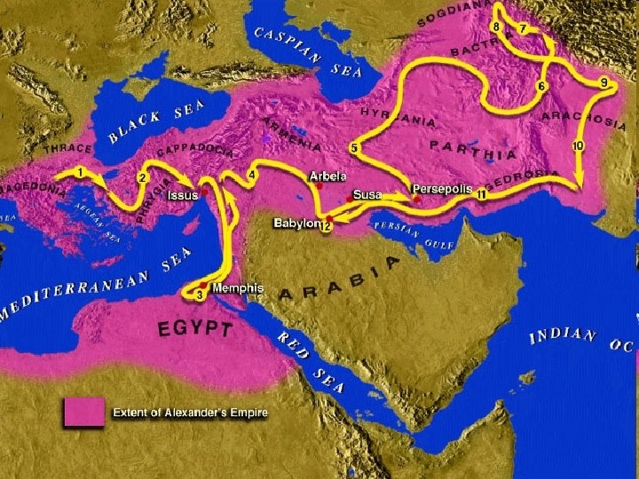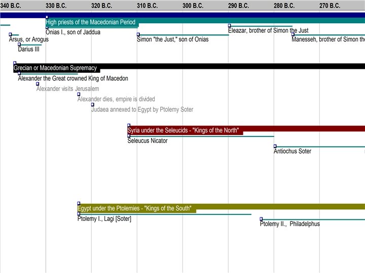 Alexander the Great • • • 336 – Crowned King of Macedonia 333 – Battle of Isis, Conquers Syria 332 – Conquers Egypt, Visits Jerusalem 331 – Battle of Arbela, Conquers Persia 323 – Dies in Babylon
