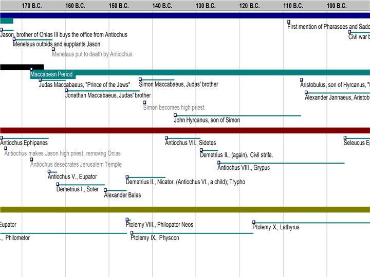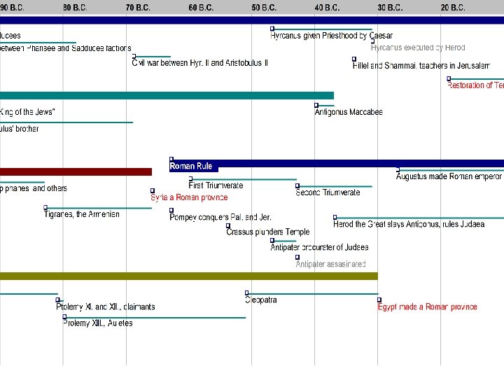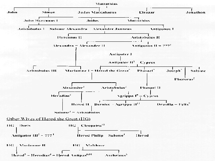 The Hasmoneans • • Judas Maccabaeus (166 -160) Jonathan Maccabaeus (160 -143) Simon Maccabaeus (143 -135) John Hyrcanus (135 -104) Aristobulus (104 -103) Alexander Jannaeus (103 -76) Salome Alexandra (76 -69) Hyrcanus II and Aristobulus II (69 -63)