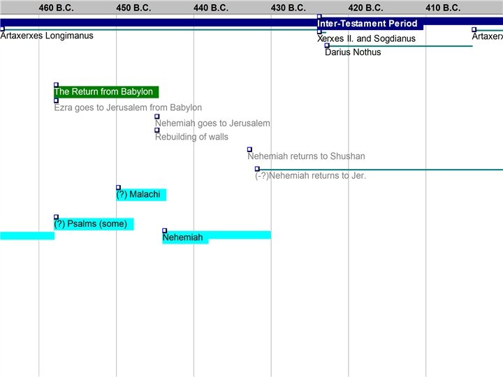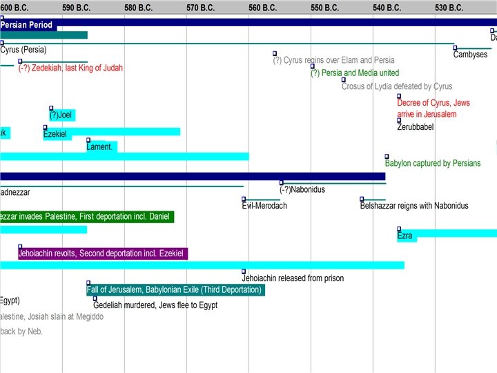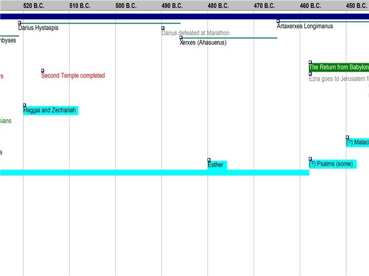 Chronology at the End of the Old Testament • • 722 BC – Assyria Conquers Israel 586 BC – Babylon Conquers Judah 538 BC – Persia Conquers Babylon 536 BC – Exiles Begin to Return 516 BC – Second Temple Completed 480 BC – Esther Queen of Persia 444 BC – Nehemiah Rebuilds Walls 430 BC – Malachi