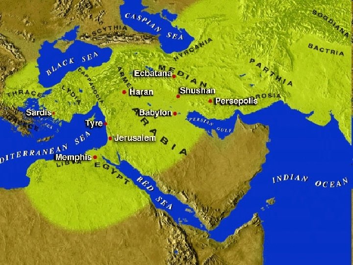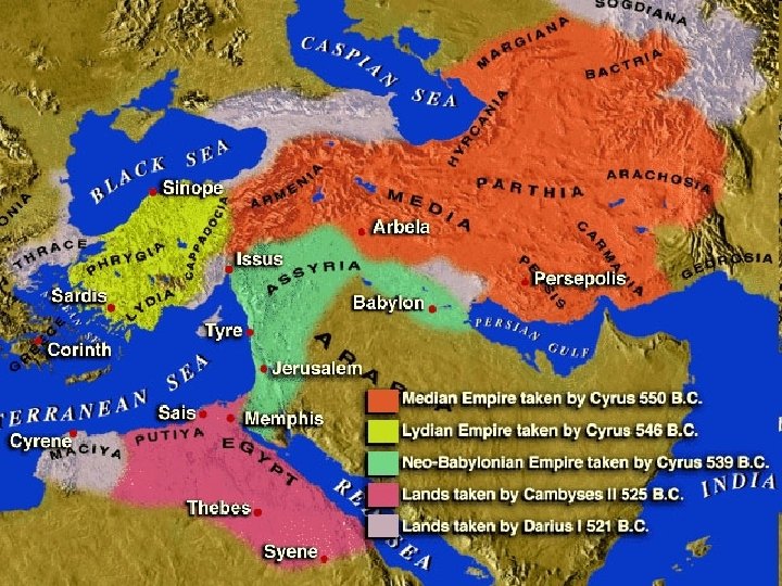 Persian Rulers • • • Cyrus (556 -527 BC) Cambyses (527 -521 BC) Darius Hystaspis (521 -586 BC) Xerxes (486 -465 BC) Artaxerxes Longimanus (465 -424 BC) Xerxes II (424 -423 BC) Darius Nothus (423 -404 BC) Artaxerxes Mnemon (404 -358 BC) Ochus (358 -338 BC) Arsus (338 -336 BC) Darius III (336 -331 BC)