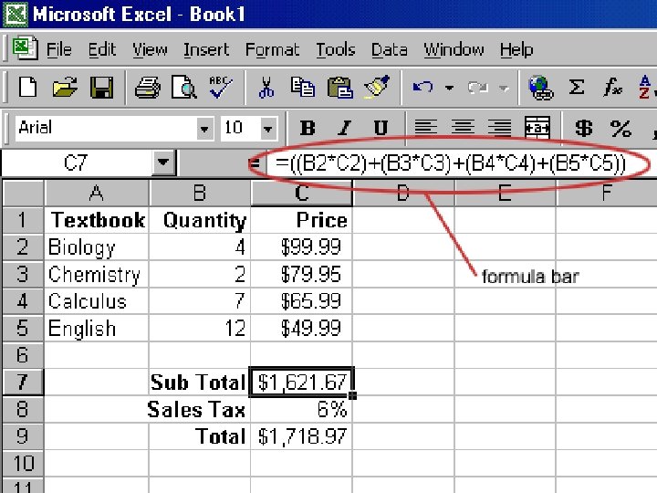 Formula: • Formulas are entered in the worksheet cell and must begin with an equal sign "=". • The formula then includes the addresses of the cells whose values will be manipulated with appropriate operands placed in between. • After the formula is typed into the cell, the calculation executes immediately and the formula itself is visible in the formula bar.