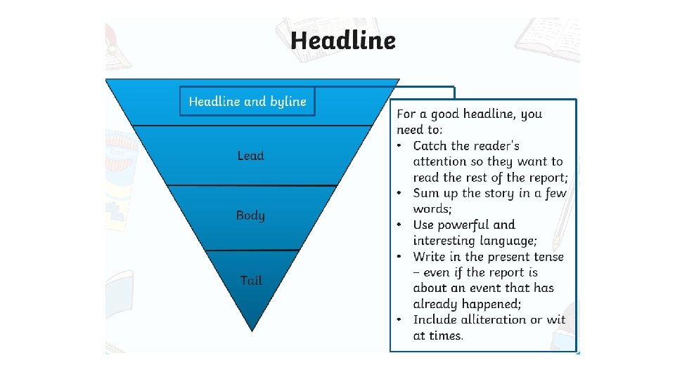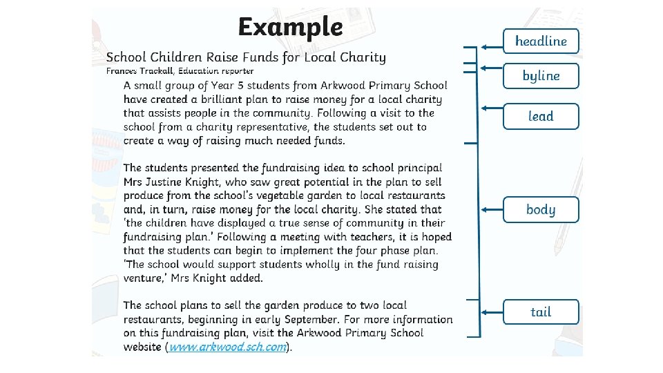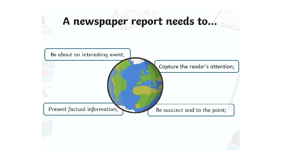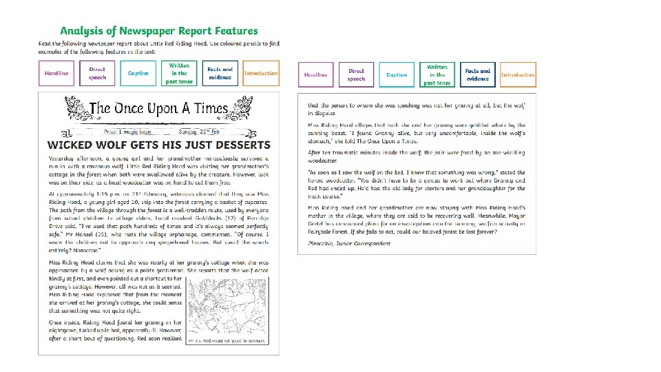 On the next slide, there is an example newspaper report. • Read the newspaper report and follow the instructions highlighting/underlining the different features of a newspaper report. • Note to parents: the answers are located on the timetable and tasks document.