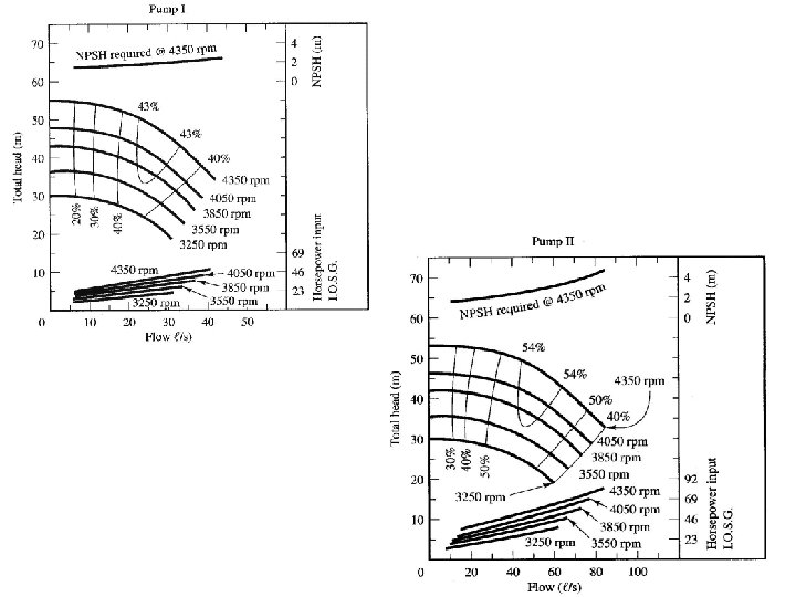 • Therefore, if the pump curve for speed N 1 is given, we can construct the pump curve for the speed N 2 using previous relationships. N 1 N 2 Effect of speed change on pump characteristic curves.