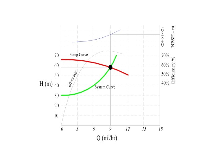 • The pump characteristic curves are very important to help select the required pump for the specified conditions. • If the system curve is plotted on the pump curves in we may produce the following Figure: Matching the system and pump curves. • The point of intersection is called the operating point. • This matching point indicates the actual working conditions, and therefore the proper pump that satisfy all required performance characteristic is selected.