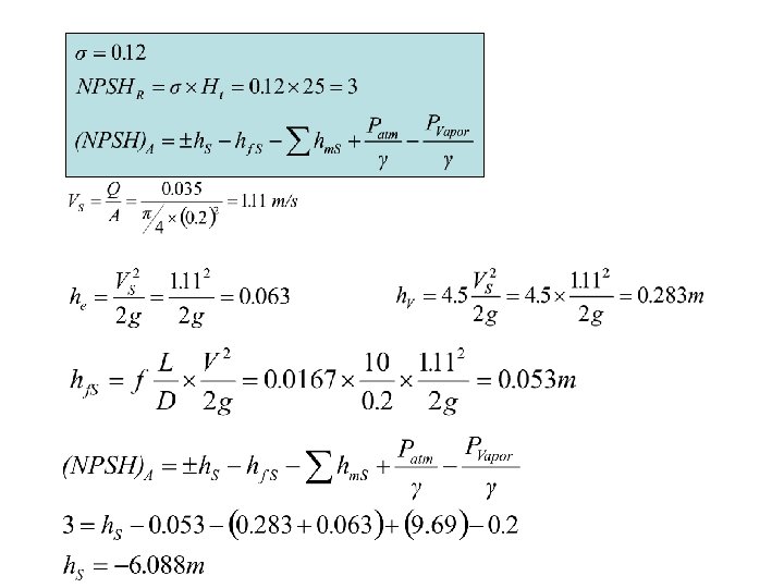 Example 1 A Pump has a cavitation constant = 0. 12, this pump was instructed on well using UPVC pipe of 10 m length and 200 mm diameter, there are elbow (ke=1) and valve (ke=4. 5) in the system. the flow is 35 m 3 and The total Dynamic Head Ht = 25 m (from pump curve) f=0. 0167 Calculate the maximum suction head