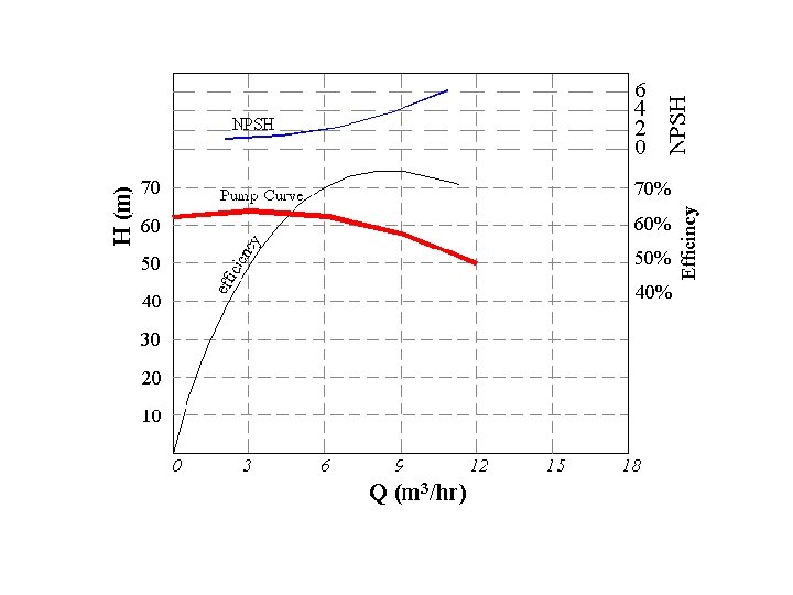 Pump Characteristic Curves • Pump manufacturers provide information on the performance of their pumps in the form of curves, commonly called pump characteristic curves (or simply pump curves). • In pump curves the following information may be given: • the discharge on the x-axis, • the head on the left y-axis, • the pump power input on the right y-axis, • the pump efficiency as a percentage, • the speed of the pump (rpm = revolutions/min). • the NPSH of the pump.