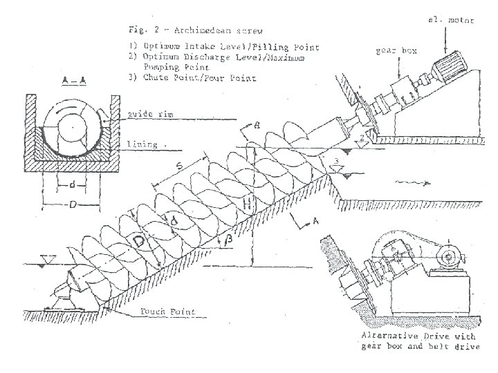 Screw pumps. • In the screw pump a revolving shaft fitted with blades rotates in an inclined trough and pushes the water up the trough.
