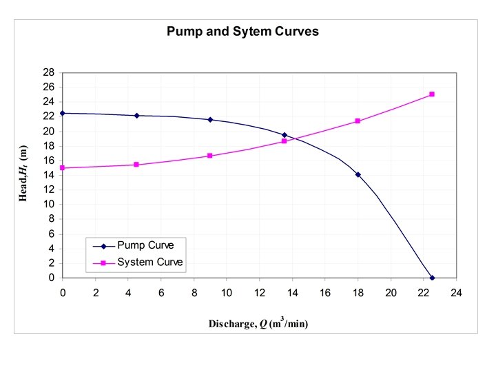 1) System curve: • The head required from pump = static + friction + velocity head • Hstat = 15 m • Friction losses (including equivalent entrance losses) = where Q in m 3/s