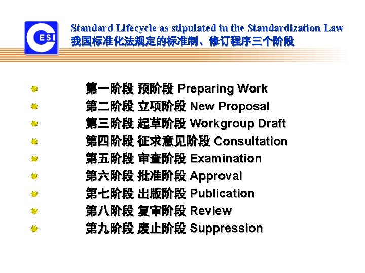 The IT Standardization System of China 中国信息技术标准化系统 China Electronics Standardization Institute 2020/11/9 2007 -3 信息产业部电子 业标准化研究所 1