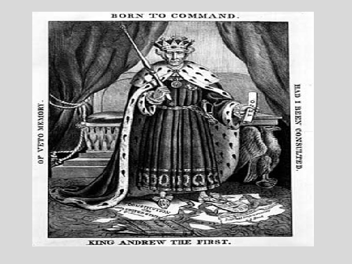 “The People’s President” • 1 st President from a western state. (TN) • Parents were frontier farmers from South Carolina • Fought in the American Revolution (at 13) and in the War of 1812 • Judge and land broker; Plantation owner • Nickname: “Old Hickory”