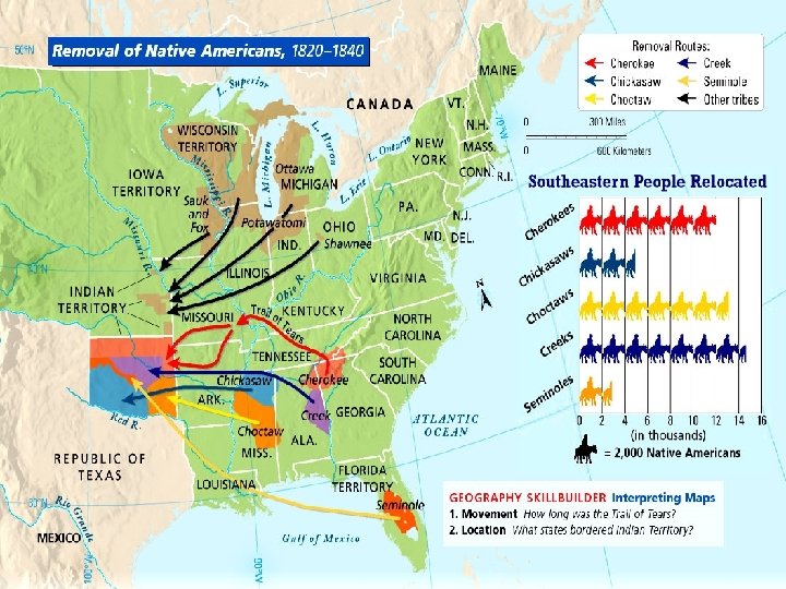 Trail of Tears - 1838 • Forced removal of 17, 000 Cherokee from Georgia to the Indian Territory. • General Winfield Scott and 7, 000 federal troops supervised the move.