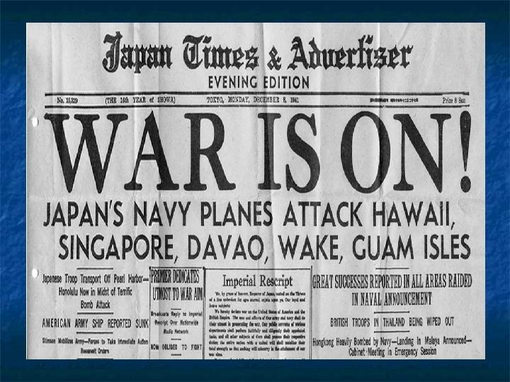 Japanese Bomb Pearl Harbour! n December 7, 1941, President Roosevelt declares it “The Day of Infamy”.