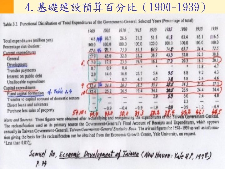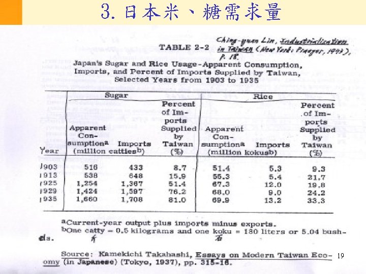 台北與東京之間政府資金流動(續) * Transfer receipts of Government General from the Central Government. **Long-term capital imports (including the net transfer receipts from the Central Government). Source: Mizoguchi Toshiyuki and Yamamoto Yuzo, “Capital Formation in Taiwan and Korea, ” in Myers and Peattie, eds. , The Japanese Colonial Empire (Princeton: Princeton University Press, 1984), p. 418. 18