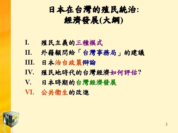 Ⅰ. 殖民主義三種模式 The Japanese Colonial Rule in Taiwan Cf. Ramon Myers and Mark Peattie, eds. , The Japanese Colonial Empire, 1895 -1945 (Princeton: Princeton University Press, 1984), pp. 4 -14. A. Comparative Colonialism: Three Major Models of Colonialism 1) The British Model: Allowed the possibility of autonomous development of the emperium’s various components, while still bearing the common burden of trusteeship. 3