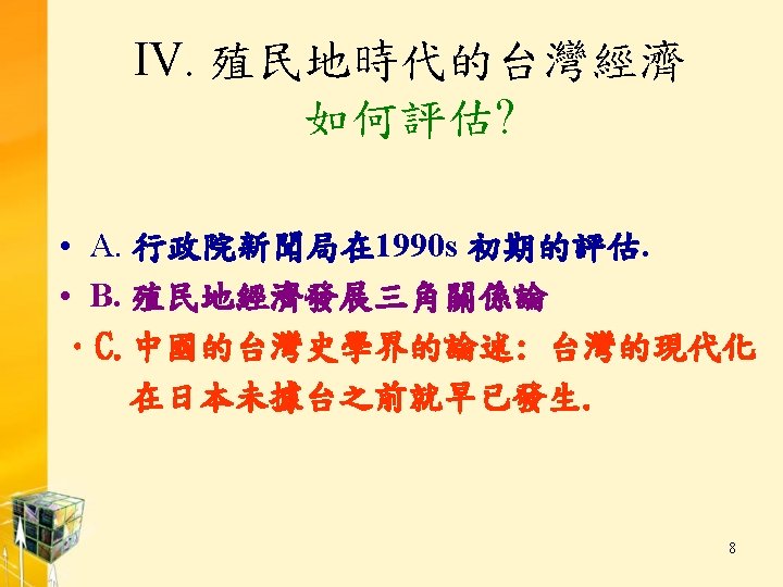 Ⅲ. 日本治台政策辯論 Japanese Policy Debates 1. Law # 63 (六三法) (March 30, 1896) gave the Governor-General a special authority to issue executive ordinances “having the same effect as the law of Japan. ” 2. 特別統治主義 3. 內地延長主義 7