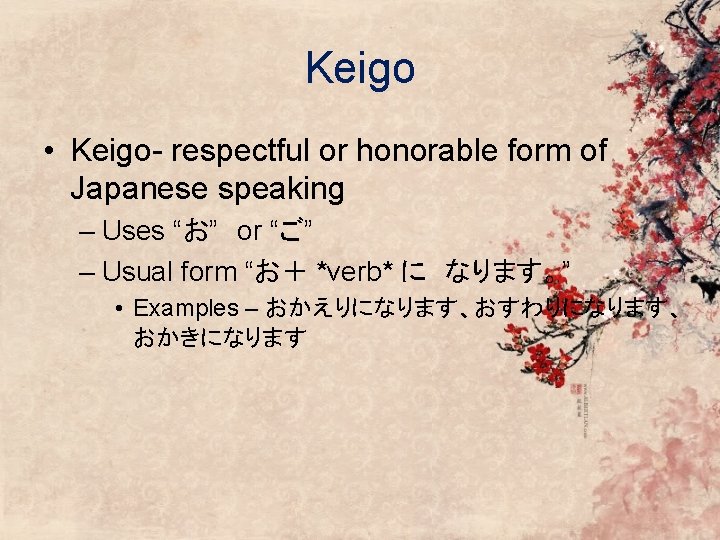 Standard Japanese • People rarely use “standard Japanese” in modern times • Uses “私, あなた, ます, ” and “です. ” • Originating from the Tokyo area during the Edo period and used the most in the Tokyo area today. • Thought of as colder and less personal than common Japanese, but it is also more respectful and the most understood. • Uses “keigo” with “zamasu”