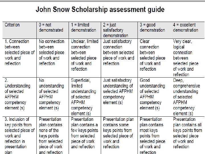 John Snow Scholarship Educational principles • Alignment with – medical schools’ public health curricula (horizontal integration) and – AFPHM competencies (vertical integration of public health medicine education) • Transparent, unbiased assessment processes