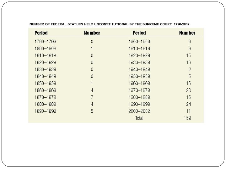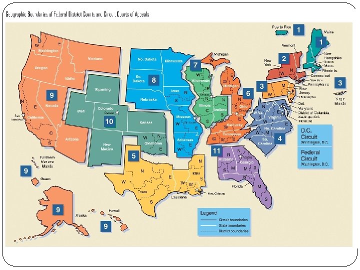 Federal system 94 District Courts: Criminal and Civil cases 13 Appeals Courts Appellate Justices – Life terms (“Good behavior”) 1 Supreme Court Judicial Review Marbury v. Madison