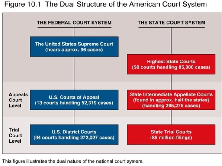 The American Legal System • The American legal system is a dual system: – state courts--actually 50 different 'systems' – federal courts • Both systems have three tiers: – trial courts--litigation begins and courts hear the facts of the case at hand (original jurisdiction) – appellate courts--decide questions of law, not fact (appellate jurisdiction) – high or State Supreme Courts then US Supreme Court