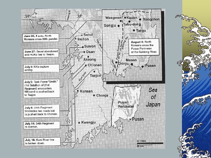 By early August, South Korean forces were confined in the southeastern corner of the peninsula. Fifty miles short of the sea, a defensive perimeter (labeled the "Pusan Perimeter") was formed. The rest of the territory was in the hands of the North Korean army.