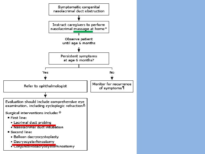 Acute dacryocystitis • The most common cause : Staph aureus. • Symptomes: erythema, swelling, warmth, tenderness of the lacrimal sac, and/or purulent discharge. Fever and Subtle early symptoms of infection include mild erythema over the lacrimal sac, poor feeding. . • A rare complication of isolated congenital NLD obstruction but occurs commonly with dacryocystoceles. • A medical emergency, complications (preseptal or orbital cellulitis, sepsis, meningitis, or brain abscess). • Blood cultures and cultures of material obtained during drainage guide definitive antimicrobial therapy • Empiric systemic antibiotic should be provided with suspected acute dacryocystitis pending culture results.