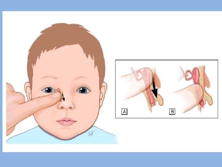 • Chronic dacryocystitis — bacterial overgrowth in the stagnant tear pool of the lacrimal sac. • characterized by mucopurulent drainage from the puncta without other signs of infection. • Nasal obstruction − Distension of the mucosal lining of the NLD from entrapment of tears can create mucoceles that extend into the nose and cause obstruction. • infants are obligate nose breathers, hence, nasal obstruction from mucoceles can cause respiratory distress !