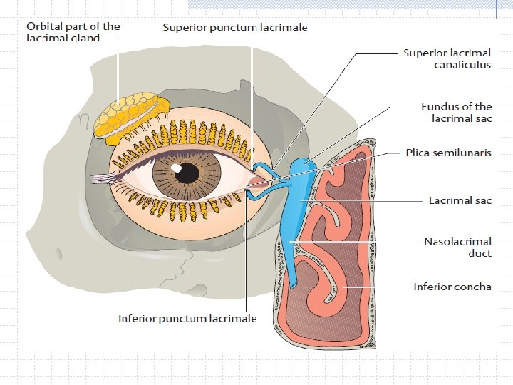 Anatomy & physiology of the lacrimal system Lacrimal gland with two components Accessory lacrimal glands Conjuctival sac Upper & lower puncti Upper & lower canaliculi Lacrimal sac NLD