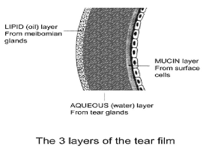 Physiology ü Tear film : * Refraction - air-tear interference for sharp & clear vision Importance of good apposition Importance of smooth ocular surfaces Importance and function of the facial pump Importance of the tear layer integrity and components Normal production rate 1. 2µl/min
