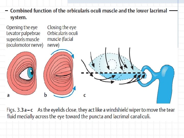• The nasolacrimal apparatus appears in the 3 -5 week and gradually forms a cord of epithelium that extends from the eyelids to the nose. • Canalization of the cord begins at the punctum in the eyelid during the third month of intrauterine life and extends toward the nose. • Canalization is usually complete by birth. Cord canalized
