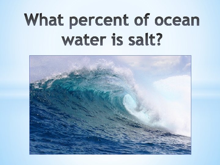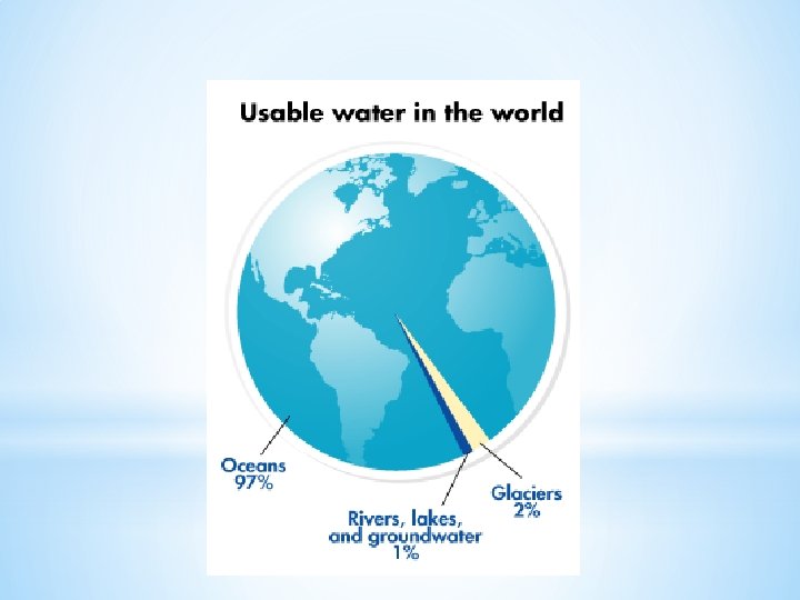 *Water on the Earth §About 71% of the earth’s surface is covered with water. §Of the total volume of water on Earth: § 97% is saltwater § 2% is freshwater frozen in ice caps and glaciers § 1% is fresh water in lakes and streams, groundwater, and water vapor in the atmosphere §In general, most of the earth’s water is located in the oceans as saltwater. Most of the freshwater on Earth is located in glaciers and ice caps. Lesser amounts are found in atmospheric moisture, rivers, lakes, streams, and groundwater. §Most of the freshwater on Earth is located in glaciers and ice caps.