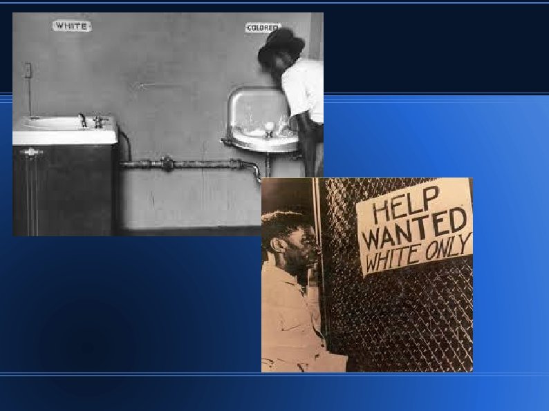 Jim Crow Laws General term for a variety of state and local laws Mandated separation of the races (segregation) Applied to virtually all public facilities and services Also often applied to residential areas, loan policies of banks, and many private businesses “Separate but Equal”
