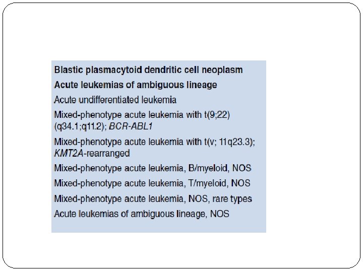 4. Cytochemical analysis: (performed in some countries instead of immunophenotyping) e. g. Myeloperoxidase and Sudan black are positive in AML cases. 5. Cytogenetic and molecular studies: to identify leukaemia specific mutations , translocations, chromosomal abnormalities