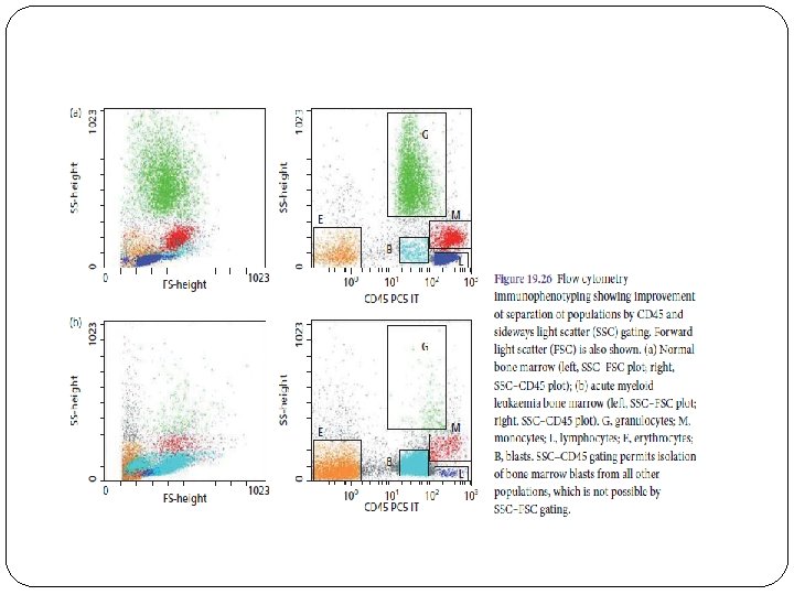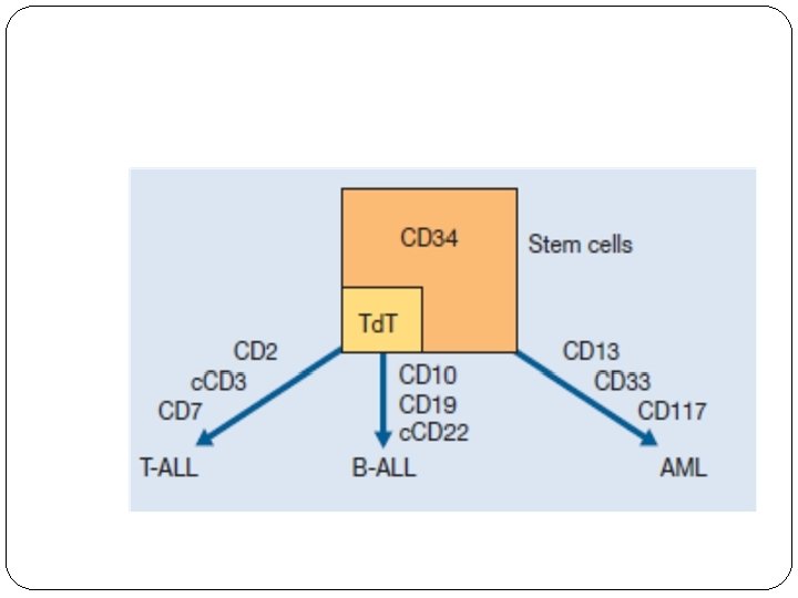 3. Immunophenotyping (flow cytometry) : Immunophenotyping is very useful in distinguishing ALL from AML, subtyping of them. The typical ‘myeloid immunophenotype’ is CD 13, CD 33+ CD 117, and Td. T−. The lymphoid phenotype is : CD 10+ , CD 19+, c. CD 22+ for B-ALL, CD 2+ , c. CD 3+, CD 7+ for T-ALL