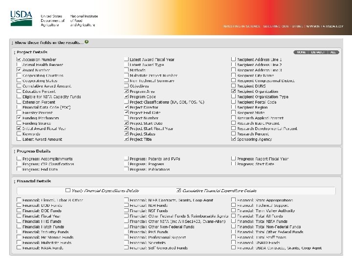Two Ways to View Results: 1. Document View accommodates large text or multiple entry text fields in Progress Reports including the Progress Details fields and Project CRIS Classifications 2. Tabular View (Default) – similar to Financial Details nifa. usda. gov/data
