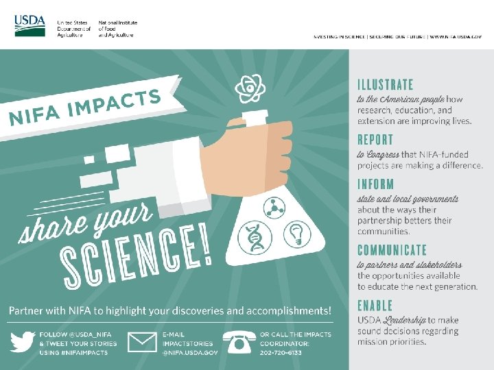 Share Your Science at any time of the year! What to communicate • Manuscript publication in a major journal • Photos, videos, press releases, other publicity of your work • Updates on major accomplishments How to communicate it • Email your NPL directly • Email Impact. Stories@nifa. usda. gov • Twitter: @USDA_NIFA #NIFAimpacts Seek assistance from your university’s public affairs office