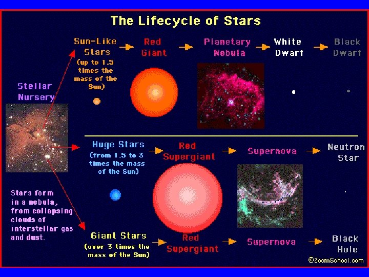 • Stage Five - Fusion stops and the iron atoms start to absorb energy; this energy is eventually release in a powerful explosion called a Supernova; a supernova can light up the sky for weeks.