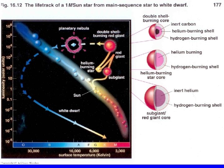 • Stage Six- Gravity causes the last of the star’s matter to collapse inward and compact into an extremely dense White Dwarf core that glows with a white hot light.