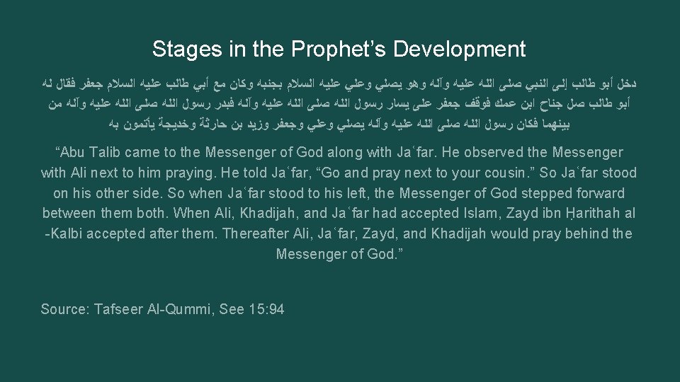 Stages in the Prophet’s Development • It seems during this 3 -year period his prayer consisted only of sujood per the following tradition: ﻭﻛﻨﺎ ﻧﺴﺠﺪ ﻭﻻ ﻧﺮﻛﻊ , ﺻﻳﺖ ﻗﺒﻞ ﺍﻟﻨﺎﺱ ﺳﺒﻊ ﺳﻨﻴﻦ “Imam Ali said, “I prayed before other people for seven years. We used to do sujood and not ruku’. ” Source: Sharh Nahjulbalagha, v. 3, p. 258