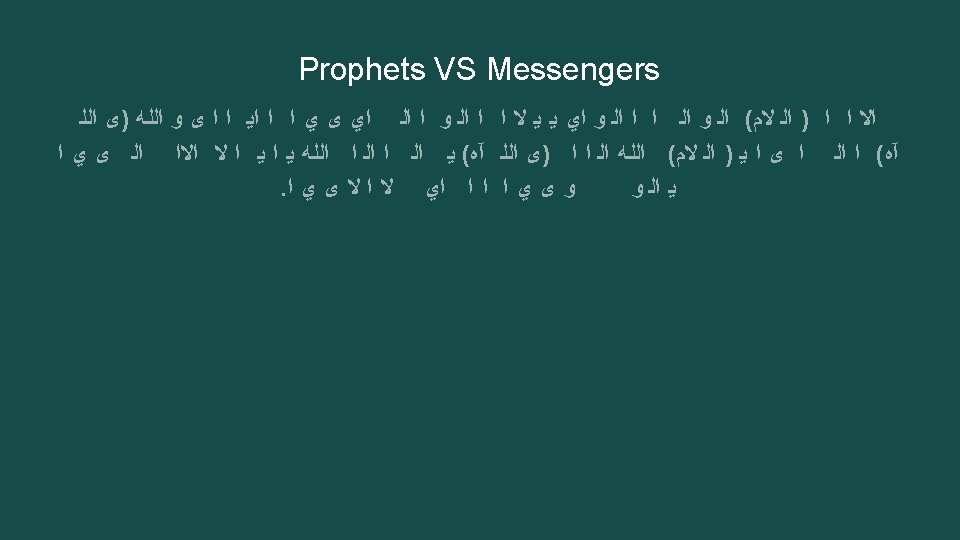 Prophets VS Messengers ﻛﺎ ﻭﻻ ﺍ ﺍ ﺍﻟ ﻭ ﺍ ﺍﻟ ﺍﻱ ﻯ ﻱ ﺍ ﺍﻟ ﻻ ﺍ ﺍ ﺍﻟ ﻭ ﺍﻱ ﺍﻟ ﻯ ﻱ ﺍﺍ ﺍ ﺍ ﺍ ) ﺍﻟ ﻻﻡ( ﺍﻟﻠﻪ “From Zurara who has said the following “I asked abu ‘Abdallah about the words of God, the Most Holy, the Most High, ‘He was a messenger, a prophet’. What is a messenger and what is a prophet? ’” The Imam said, “A prophet is one who sees things in his dream and hears the voice but does not see the angel. The messenger is one who hears the voice, in his dreams and sees the angel. ”