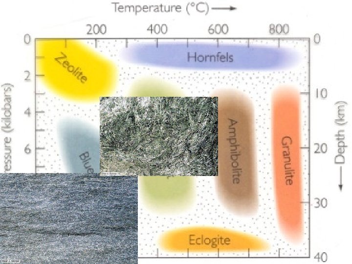 Metamorphic facies • P-T conditions, presence of fluids induces different metamorphic mineral assemblages (governed by thermodynamics/ kinetics) • These assemblages are lumped into metamorphic facies (or grades)