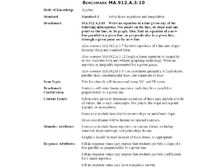 The line shown in the graph below can be represented by the equation 3 x + 4 y = 17. Which of the following is the equation for a line that is perpendicular to the one in the graph and passes through the point (3, 2)? A. y = − B. y = − C. y = D. y = +4 +2 − 2 MA. 912. A. 3. 10: Write an equation of a line given: two points on a line, the slope and one point on a line, or its graph. Also find the equation of new line parallel or perpendicular to a given line