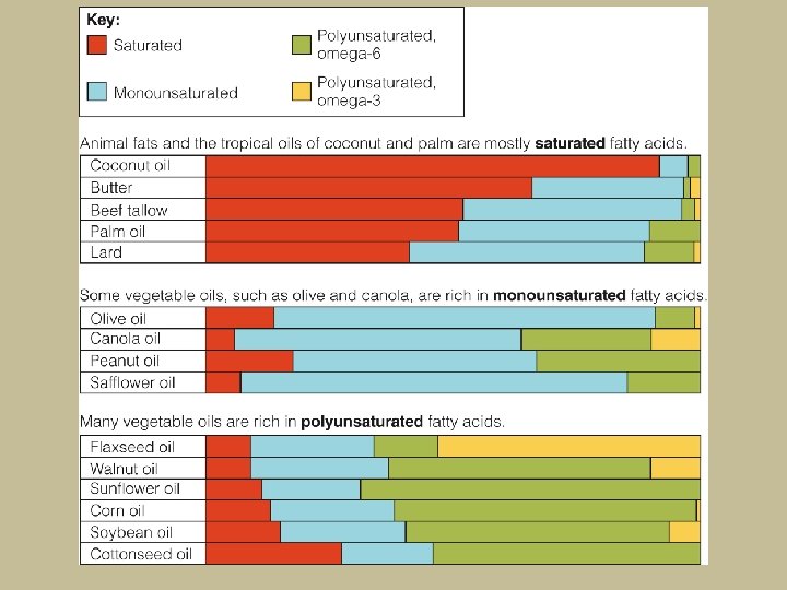 Polyunsaturated Fatty Acids (PUFA’s) § Omega-3: 1 st double bond is 3 carbons from methyl end; ex: linolenic acid • fatty fishes § Omega-6: 1 st double bond is 6 carbons from methyl end; ex: linoleic acid § many vegetable oils § Liquid at 77 F