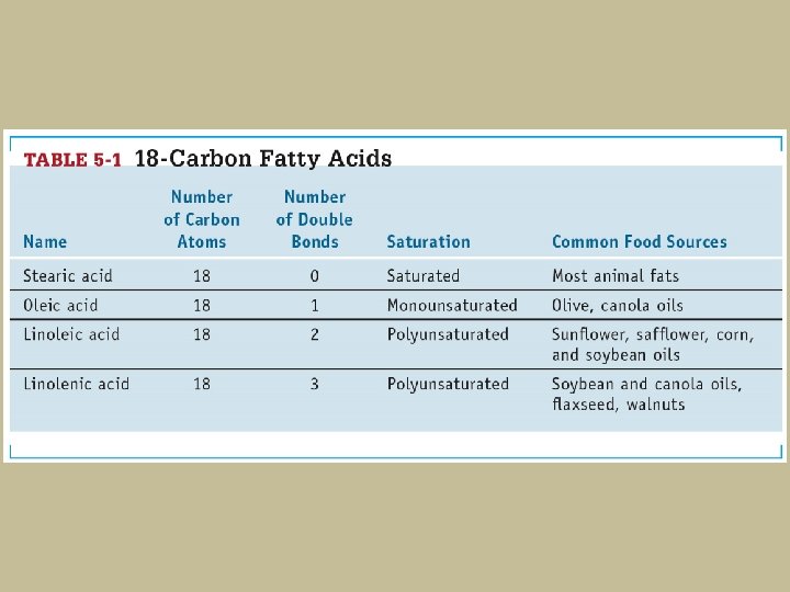 Saturated Fatty Acids v NO double bonds v Solid at 77 F v Found in meat, dairy, tropical fat v Max. allowed is 1/3 total daily fat