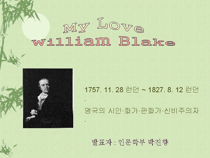 본문해석 2 My mother taught me underneath a tree, 엄마는 나무 밑에서 나를 가르쳤어요. And, sitting down before the heat of day, 해가 뜨거워지기 전에 엄마는 앉아서 She took me on her lap and kissed me, 나를 무릎 위에 앉히고 입맞추시며 And, pointed to the east, began to say: 동족을 가리키며 말씀하셨죠.