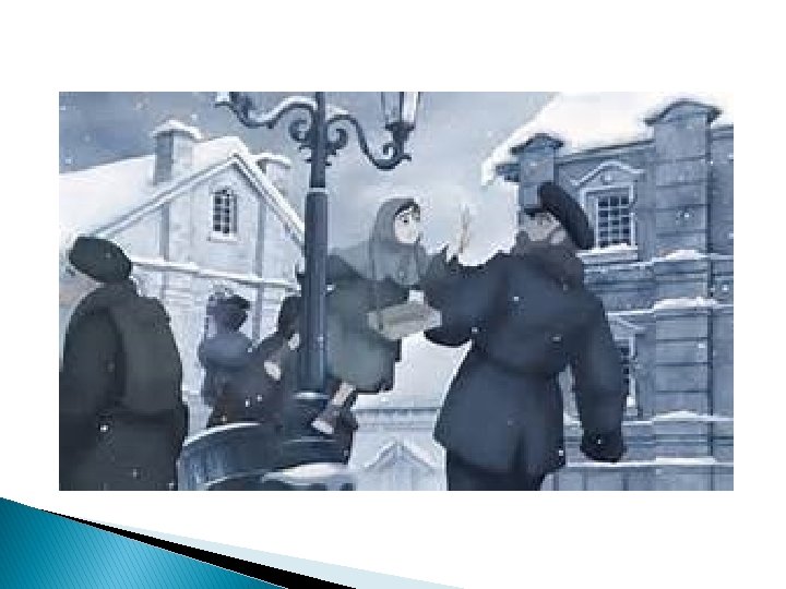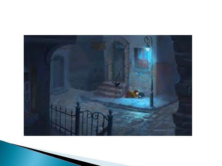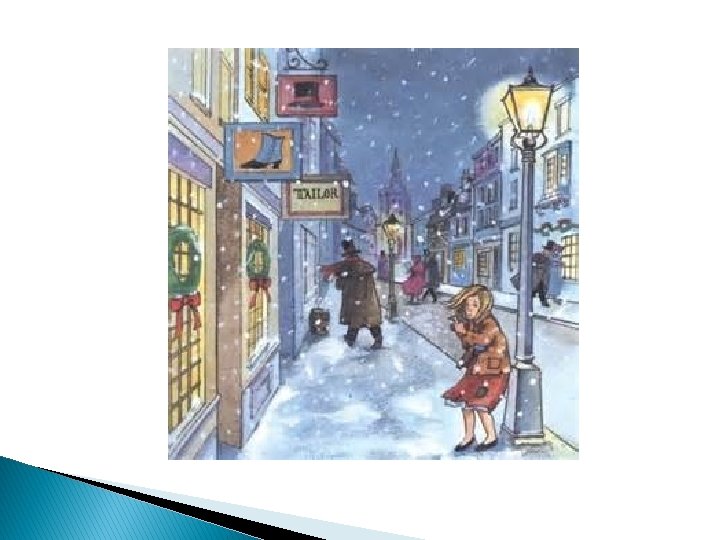 � Lights were shining from every window, and there was a savory smell of roast goose, for it was New Year's Eve — yes, she remembered that. In a corner, between two houses, one of which projected beyond the other, she sank down and huddled herself together. She had drawn her little feet under her, but she could not keep off the cold; and she dared not go home, for she had sold no matches, and could not take home even a penny of money.
