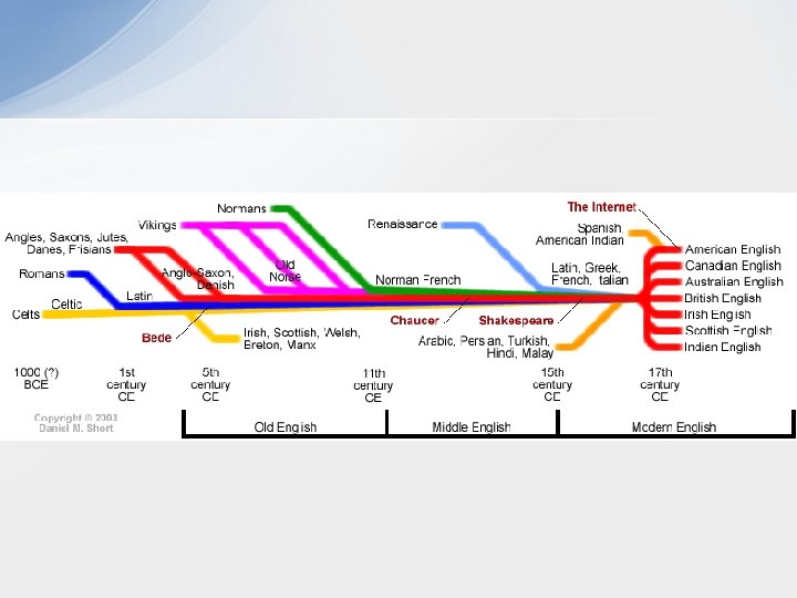 The Norman conquest and Middle English v Invasion of England in 1066 AD by the Normandy’s Duke. v Growing influence of Latin. v Some French and Germanic influences in Middle English. v The mixture of Anglo-Norman and Old English formed Middle English. v Around 1500 AD, the Modern English rose.