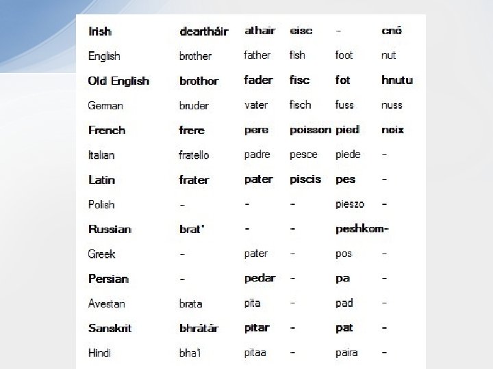 Indo-European and Germanic influences Indo-European family: -Latin and The Modern Romance languages; -The Germanic languages; -The Celtic languages; -… Father-vater; pitr